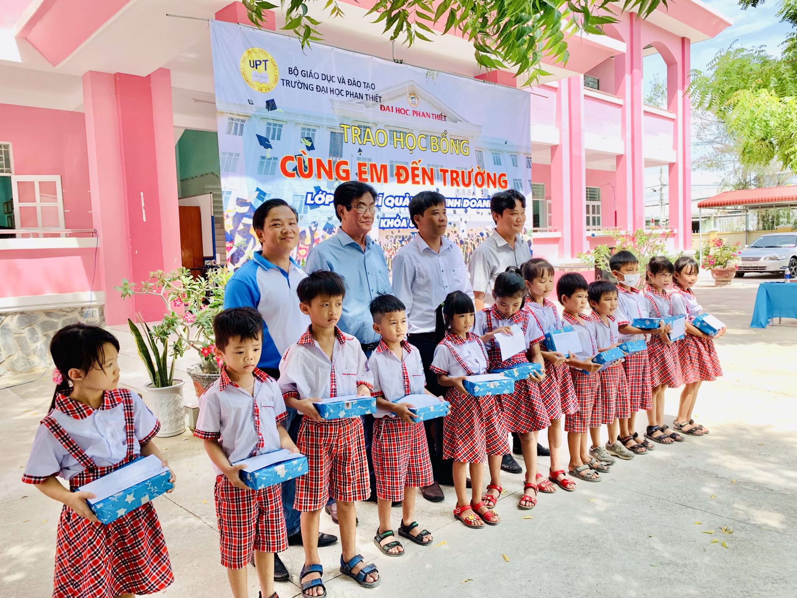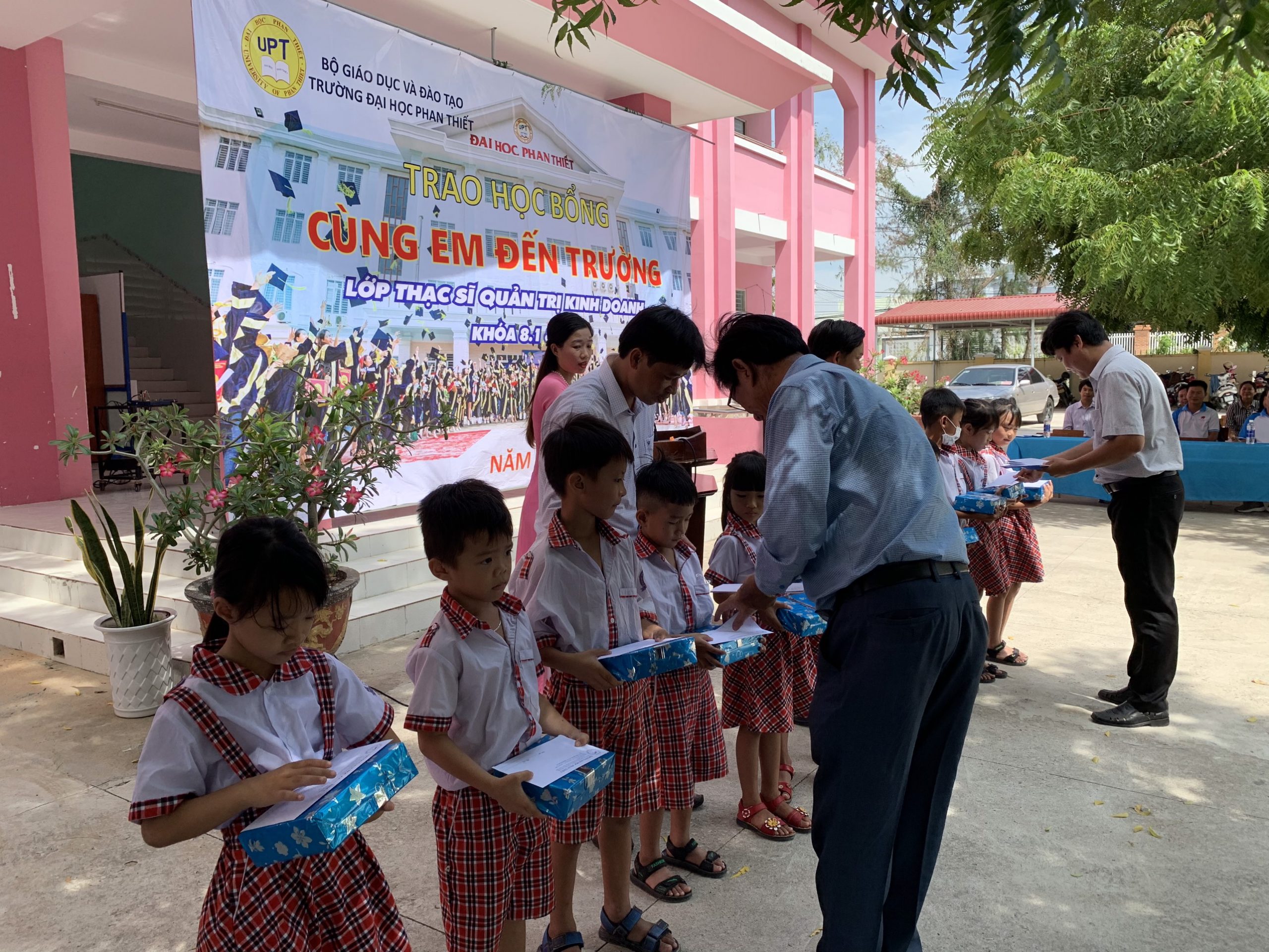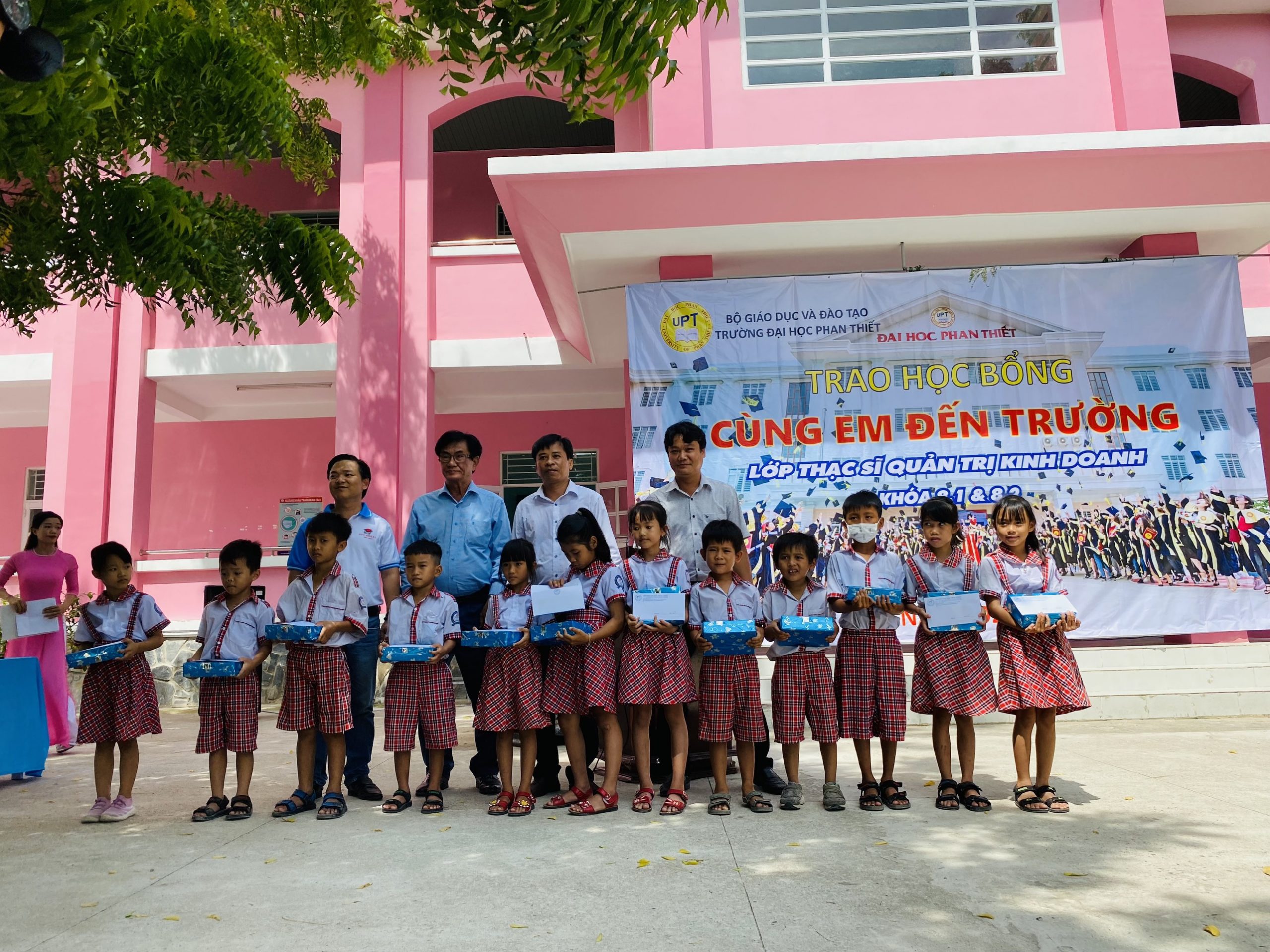 Trong chương trình, Ban lãnh đạo Trường Đại học Phan Thiết cũng như Học viên các Lớp Thạc Sĩ Khóa 8.1 và 8.2 của ngành Quản Trị Kinh Doanh đang theo học tại Đại học Phan Thiết đã đến và trao tặng 22 suất học bổng, mỗi suất trị giá 1.000.000 đồng cho các em học sinh nghèo hiếu học tại Trường Tiếu học Vĩnh Tiến (Thôn Vĩnh Tiến – Xã Vĩnh Tân Huyện Tuy Phong – Tỉnh Bình Thuận).