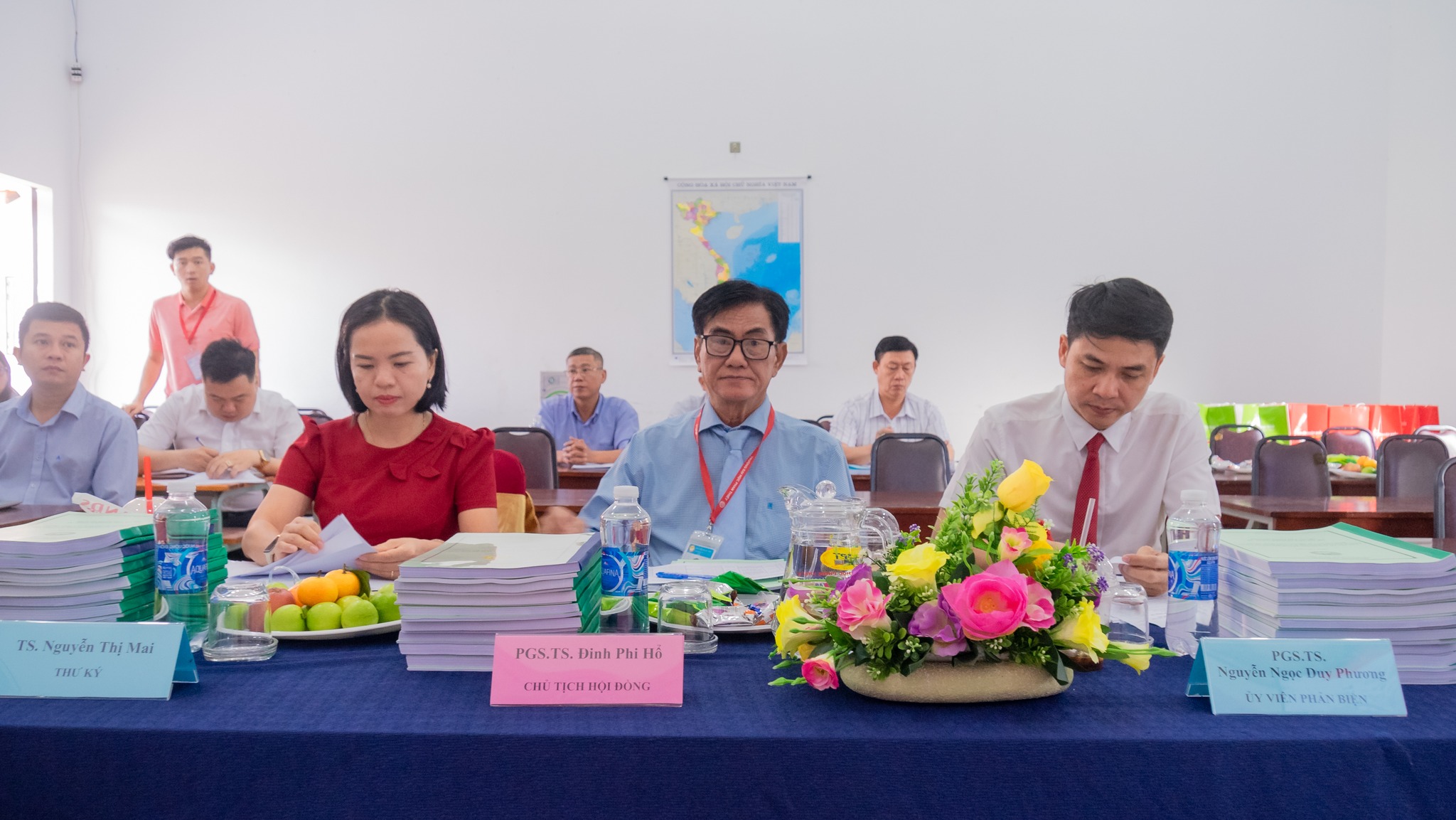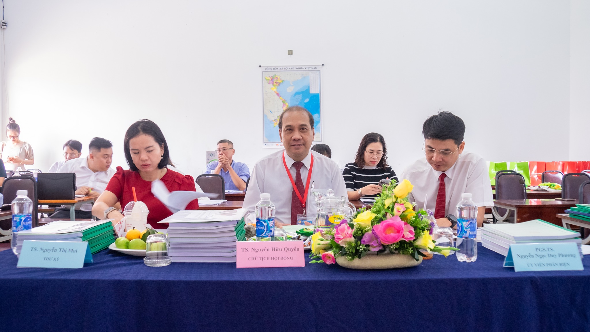 Tham gia Hội đồng chấm Đề án tốt nghiệp có PGS.TS. Đinh Phi Hổ – Phó Hiệu trưởng trường Đại học Phan Thiết – Chủ tịch Hội đồng 1; TS. Nguyễn Hữu Quyền – Giảng viên trường Đại học Phan Thiết – Chủ tịch Hội đồng 2; PGS.TS. Nguyễn Ngọc Duy Phương – Giảng viên trường Đại học Quốc tế – Đại học Quốc gia TP. Hồ Chí Minh – Ủy viên phản biện và TS. Nguyễn Thị Mai – Giảng viên trường Đại học Ngoại Thường CS2 – Thư ký Hội đồng.