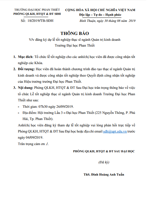 Thông báo đăng ký tham dự lễ tốt nghiệp thạc sĩ ngành Quản trị kinh doanh