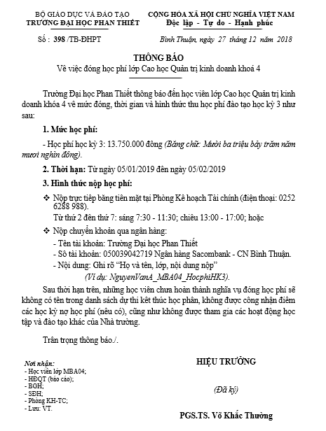 Thông báo học phí học kỳ 3 lớp MBA04