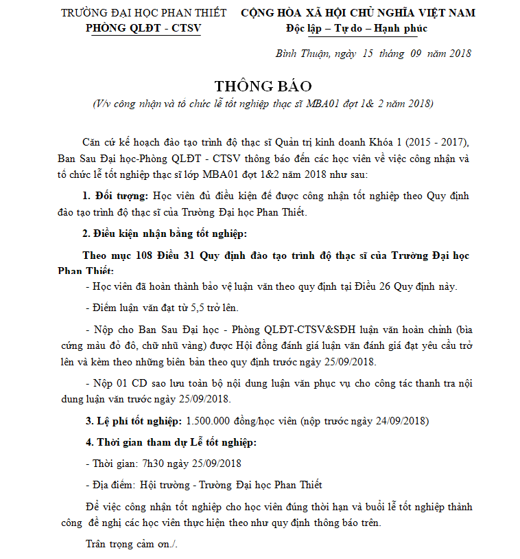 Thông báo lễ tốt nghiệp thạc sĩ Quản trị kinh doanh khoá 1.2018
