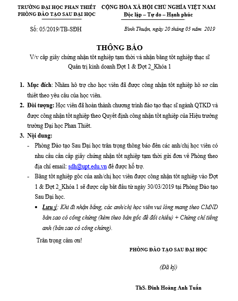 Thông báo nhận bằng tốt nghiệp và chứng nhận tạm thời các khoá Quản trị kinh doanh