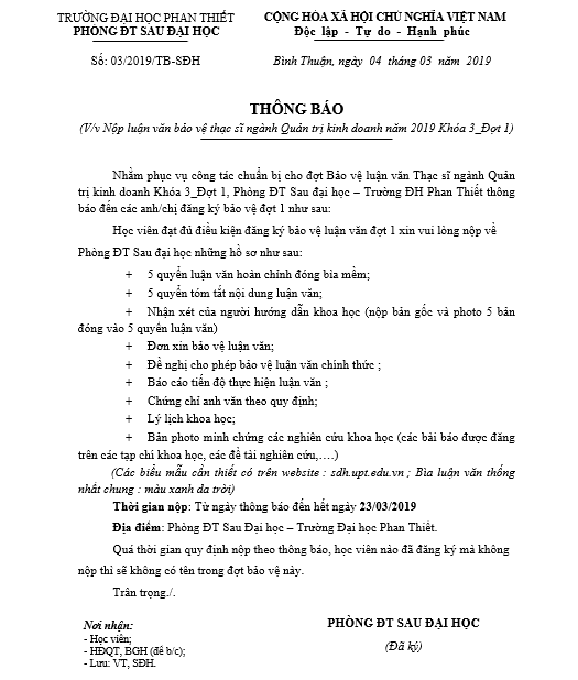 Thông báo nộp luận văn thạc sĩ Quản trị kinh doanh Khóa 3_đợt 1 năm 2019